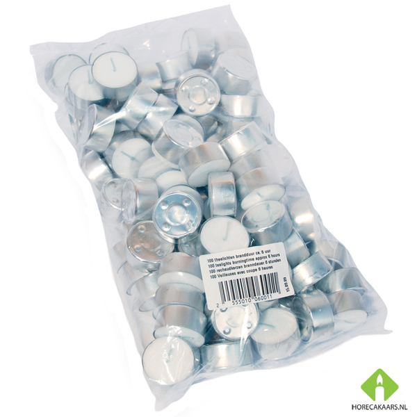 Naast sfeer en kwaliteit speelt ook gemak een belangrijke rol. De 6-uurs theelichten worden geleverd in zakken van 100 stuks, met meerdere zakken per doos. Hierdoor heeft u altijd voldoende voorraad, ook tijdens drukke periodes.